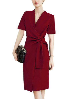 Custom | red dresses short sleeves | women's crossover V-neck dresses | tie-up waist mid dresses