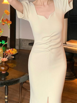 Custom | temperament dresses | vintage French dresses | short sleeve hip pack dresses | square neck long dresses