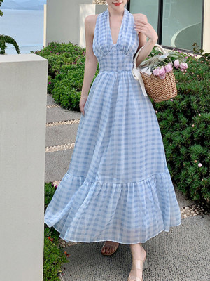 Custom blue plaid dress | chiffon V-neck dress | suspender halter neck dress | seaside resort long dress
