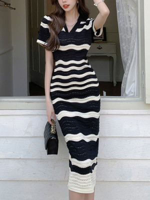 Custom striped dress | knitted dress | summer new dress | V-neck short sleeve dress