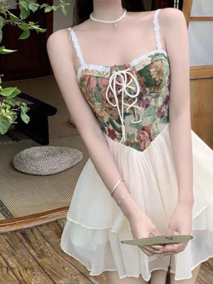 Custom dress | high-end slip dress | bandeau oil painting dress | strappy skinny dress | patchwork puffy dress